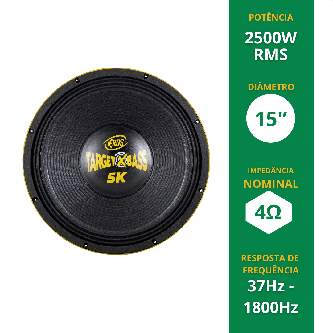 O novo Target XBass 5K chegou para redefinir o que você espera de um subgrave. Com impressionantes 2.500 WRMS de potência real e impedância em 4 Ohms, ele oferece um desempenho sonoro de alto nível, com graves firmes, profundos e extremamente envolventes.